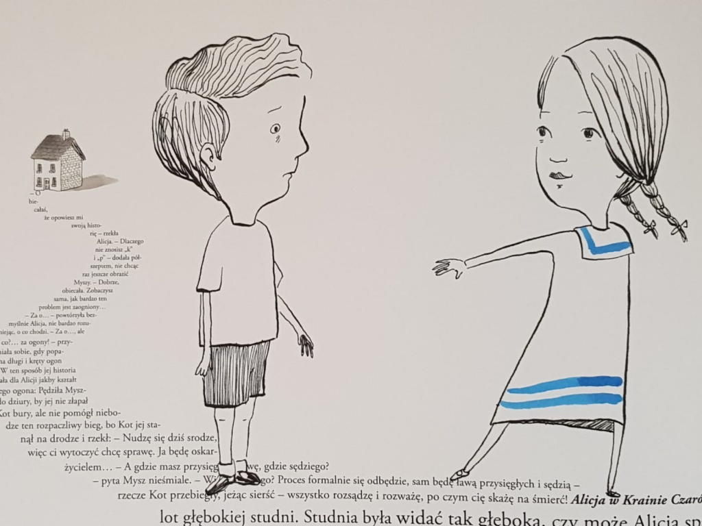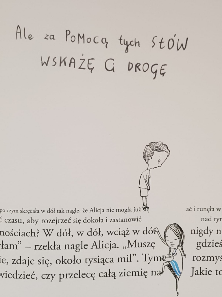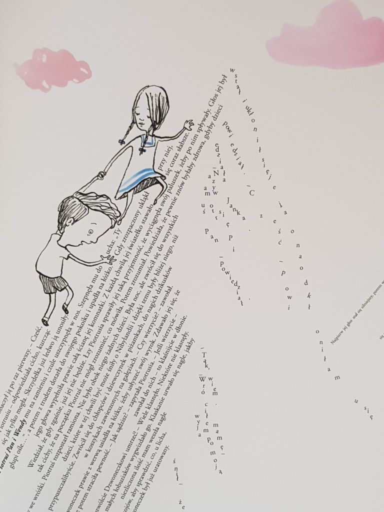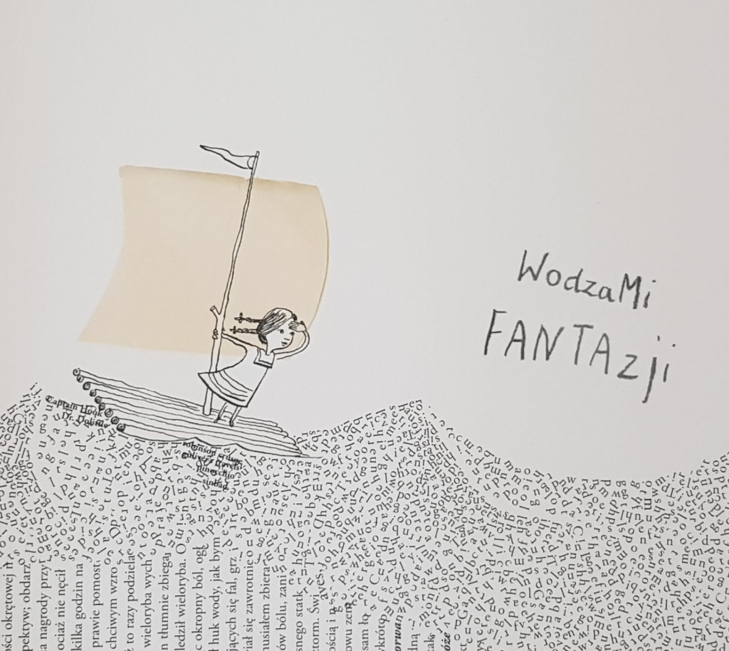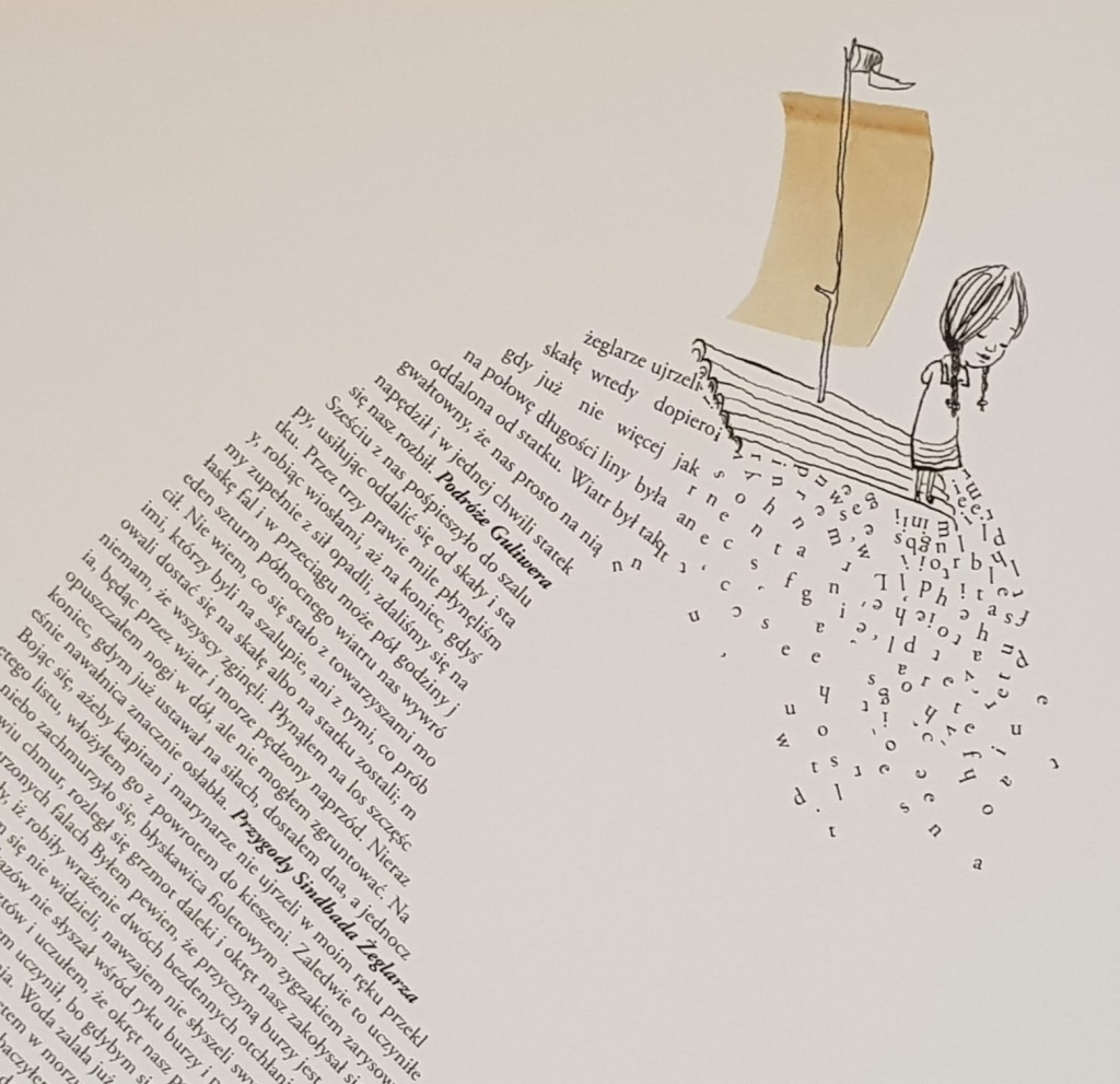 Książka ze słów utkana. Książka słowami inspirowana. Z bogactwem różnorodnych liter i cytatów wyjętych z różnych opowieści. O dziewczynce, która podróżuje na tratwie, niesiona na falach słów. Dziewczynka się rozgląda i poszukuje…. towarzysza swej podróży. Bardzo wysoka fala przenosi ją do domu chłopca, który z ciekawością ją wita. Mam wrażenie, że ten chłopiec na nią czeka. Być może czuje się samotny i zagubiony. Być może łaknie przygód. Wędrując po ścieżce złożonej ze słów, pokonując górskie szczyty (“góry wyobraźni”) bohaterowie przenoszą się do różnych miejsc, otoczonych zdaniami. Docierają do lasu, w którym pnie drzew to książki z dużą ilością gałęzi zbudowanych ze słów.