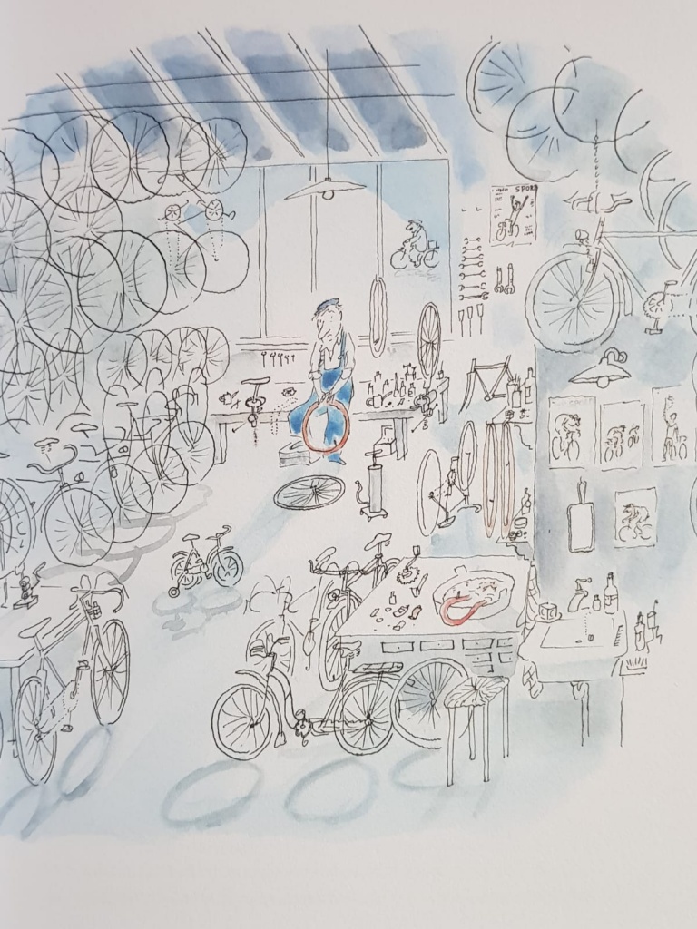 Trwam przez dłuższy moment w moim wyobrażonym świecie. Przenoszę się w czasie i zmieniam miejsce pobytu. Na chwilę staję się postronnym obserwatorem, który chowa się za dużą ilością rowerów w specjalnym, rowerowym warsztacie. Obserwuję człowieka, który jest mocno skoncentrowany na wykonywanej przez siebie czynności. Pompuje przednie koło, by za jakiś czas, ktoś mógł odebrać swój środek transportu i ponownie nim jeździć. Mężczyzna ma niebieski strój roboczy, z kieszeni którego wystaje klucz francuski. Nie znam się na sprzętach, ale klucz jestem w stanie rozpoznać. Głowę pana ozdabia równie niebieski berecik. W pracowni znajduje się bardzo dużo rowerów. Część z nich jest rozmontowana (domyślam się, że są w trakcie naprawy), inne czekają na swoją kolej, wisząc na specjalnym podwyższeniu.